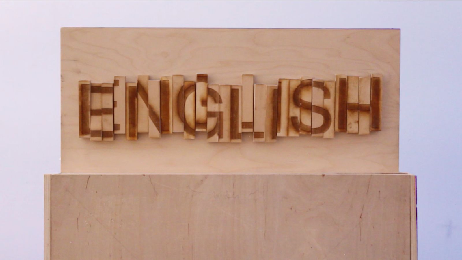 English is a kinetic wooden sculpture in which the laser-engraved word “English” is fragmented into 26 vertical slices. Each piece moves in its own unsynchronised rhythm through motors and a custom PCB circuit, producing a trembling, unstable composition.