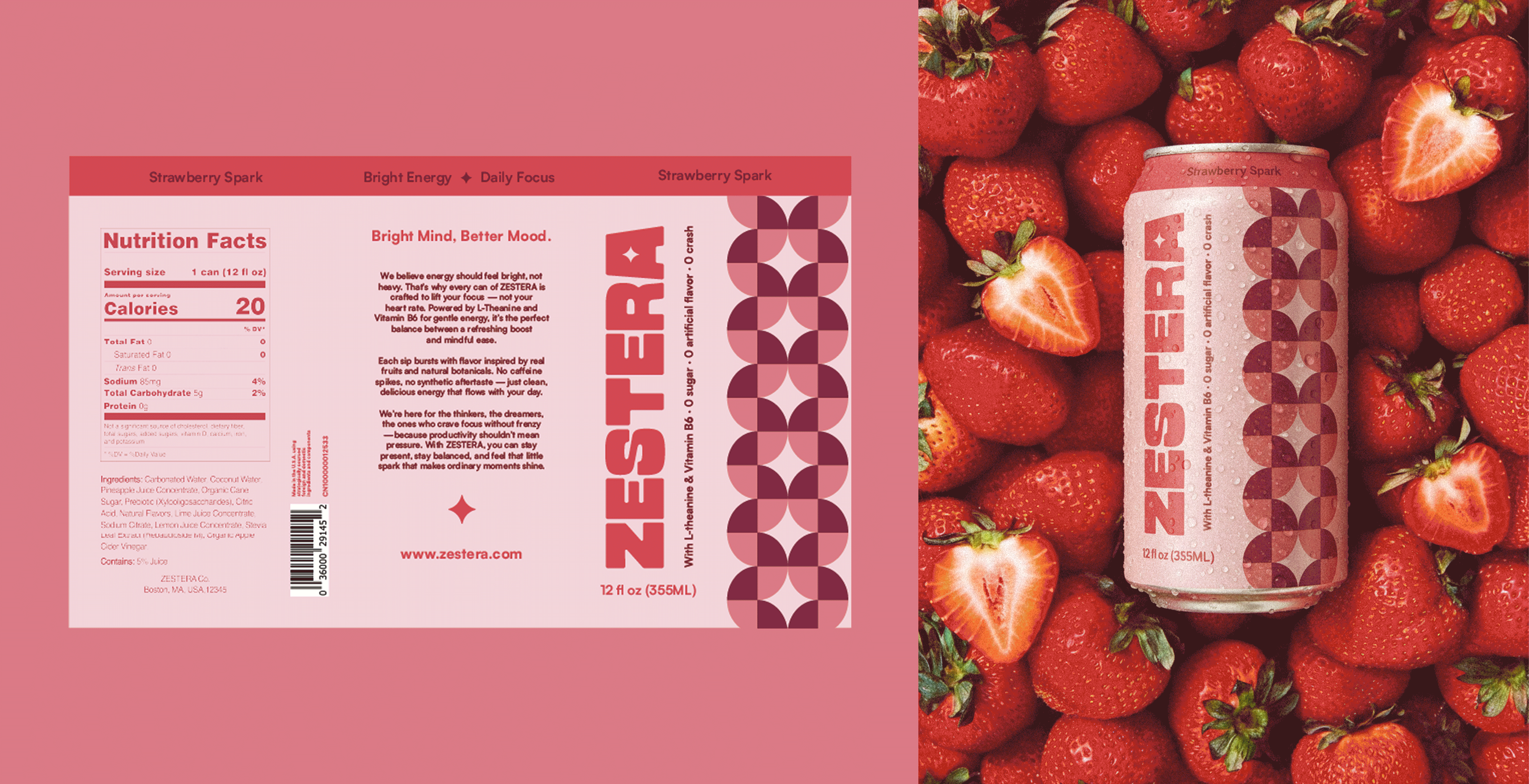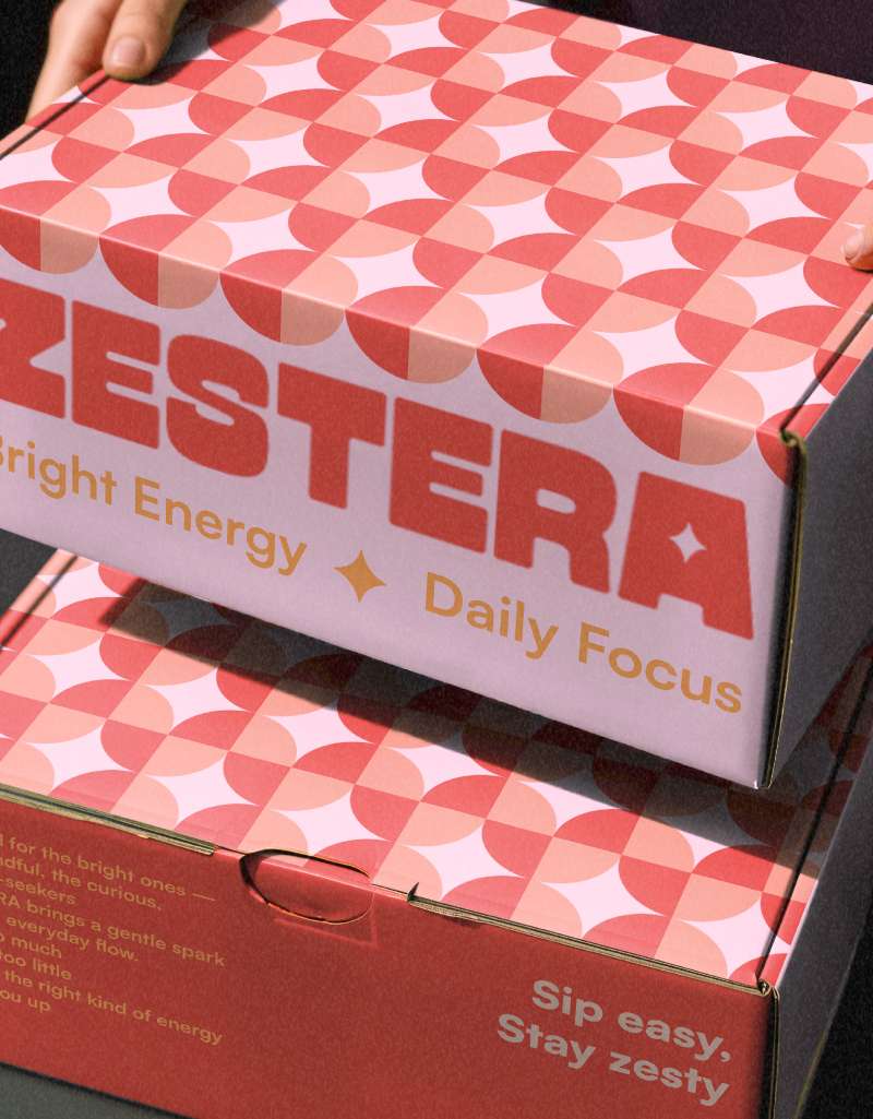 ZESTERA is a conceptual wellness beverage brand designed to redefine how people experience energy. At its core, the brand challenges the idea that alertness must come from intensity or overstimulation. Instead, ZESTERA introduces a more mindful approach: one that helps people feel awake, balanced, and mentally clear without disrupting their natural rhythm. The brand name blends Zest, symbolizing vibrancy and vitality, with Era, suggesting a new chapter in how we care for our bodies. Together, ZESTERA represents a shift from aggressive, adrenaline-driven energy drinks toward something calmer, healthier, and more intentional. The heart of the project lies in balanced stimulation. Rather than pushing the extremes, ZESTERA positions energy as a spectrum: refreshing but not harsh, bright yet grounded. The beverage is imagined to support moments of focus, creativity, and steady productivity, whether someone is easing into the morning, navigating an afternoon slump, or seeking gentle clarity throughout the day. This philosophy connects directly to the brand’s core values: Clarity, Balance, and Natural Energy. Each value shapes both the product concept and overall brand experience, framing ZESTERA as a companion for people who want to feel good, stay present, and move with intention. The visual identity translates this concept into an atmosphere. Modular geometric motifs symbolize the structured rhythm of mindful focus, while vibrant yet earthy color palettes capture the interplay between brightness and calm. Textures inspired by light, wind, and subtle movement evoke a sense of airiness, reflecting how natural energy flows through the day. Typography follows the same principles: clean, rounded, approachable, energetic yet never overwhelming. Packaging is designed to feel refreshing and modern, turning each can into an object that signals clarity, lightness, and mental steadiness. ZESTERA reframes energy drinking as an act of self-awareness rather than self-pushing. It invites people to listen to their bodies, elevate their day with intention, and find a state where focus and ease can coexist. Through its balanced philosophy and sensory-forward design, ZESTERA celebrates a new kind of energy: one that supports presence, well-being, and sustainable daily momentum.