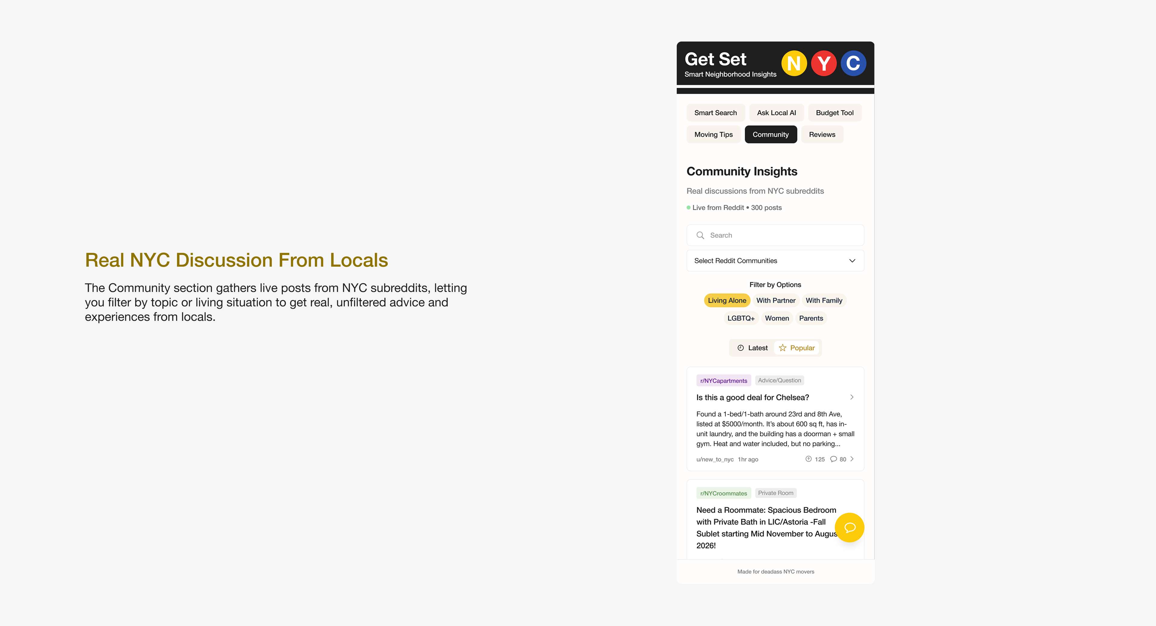 Moving to NYC is a chaotic experience. Get Set NYC is an AI-powered Chrome extension that helps people moving to NYC for the first time get real, useful neighborhood insight without digging through 20 tabs. It combines live data from Google Maps, NYC Open Data, Reddit, and more, then uses AI to answer questions contextually. From rent estimates and safety stats to local Reddit advice and budget tools, the goal was to reduce anxiety and make smarter decisions faster. Designed, developed, and launched from 0 to 1 with six integrated features. Chrome Web Store Link: https://chromewebstore.google.com/detail/coaamcmigbhipcdpnjabmjbhiejbipib?utm_source=item-share-cb