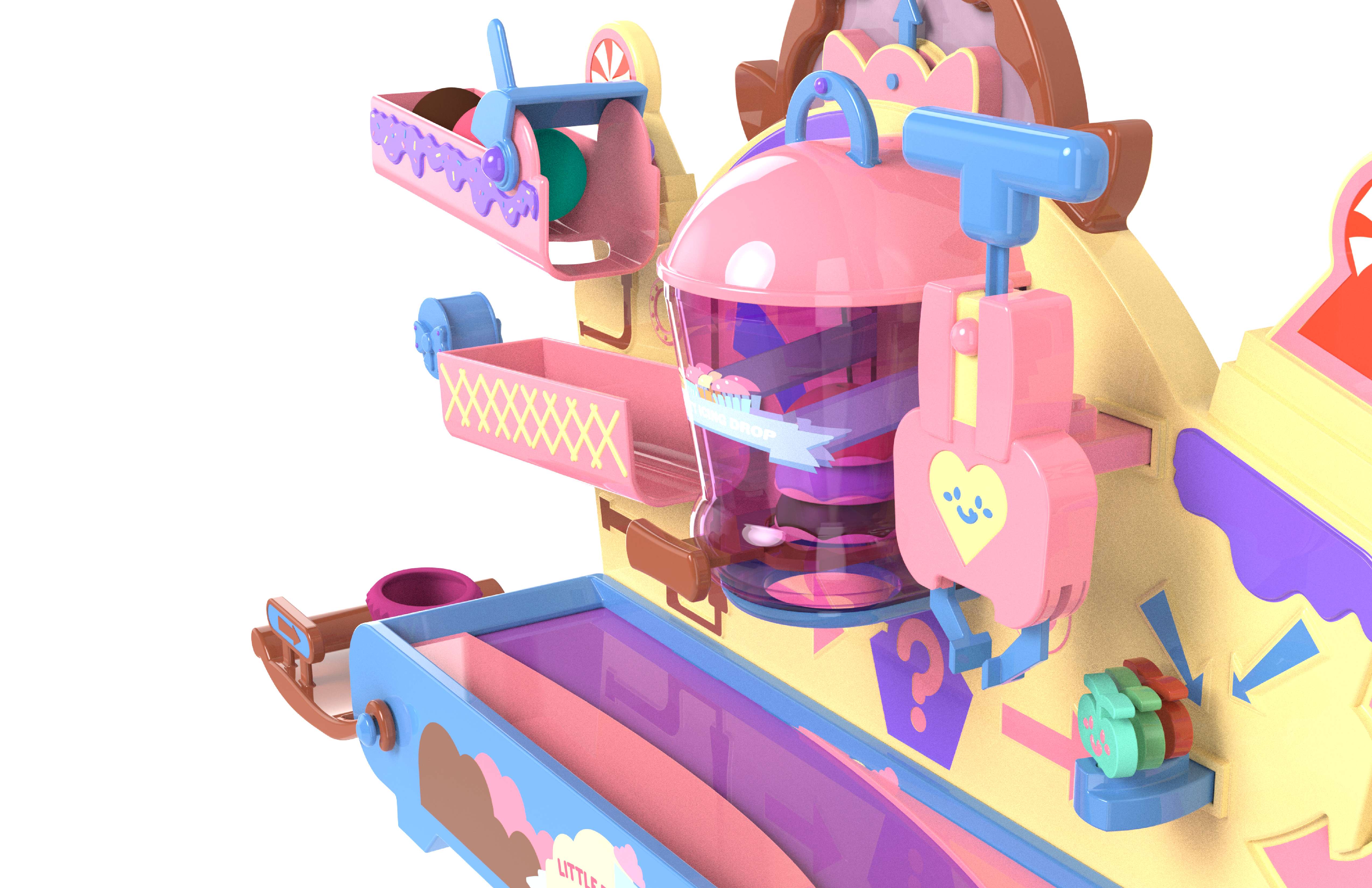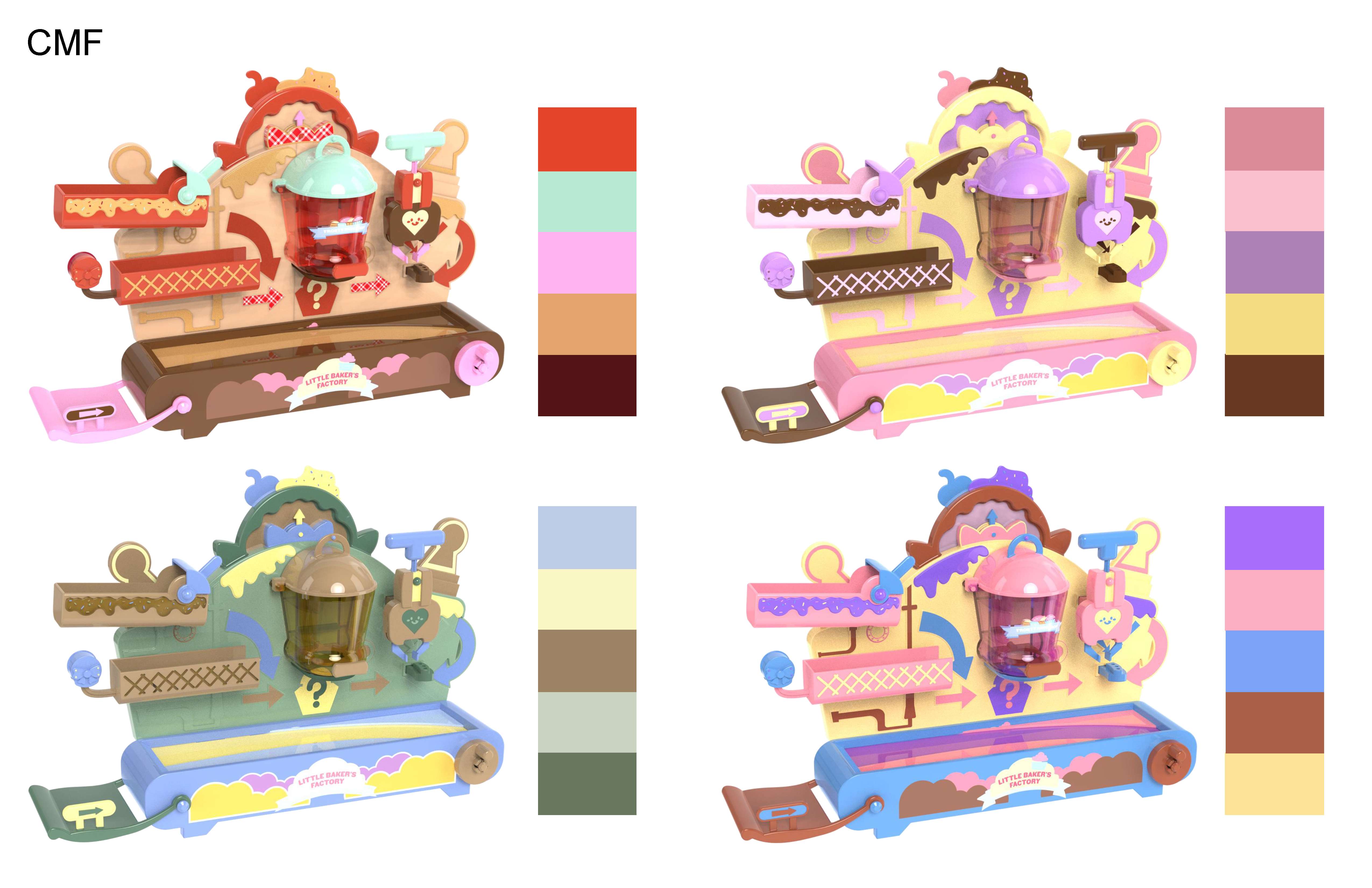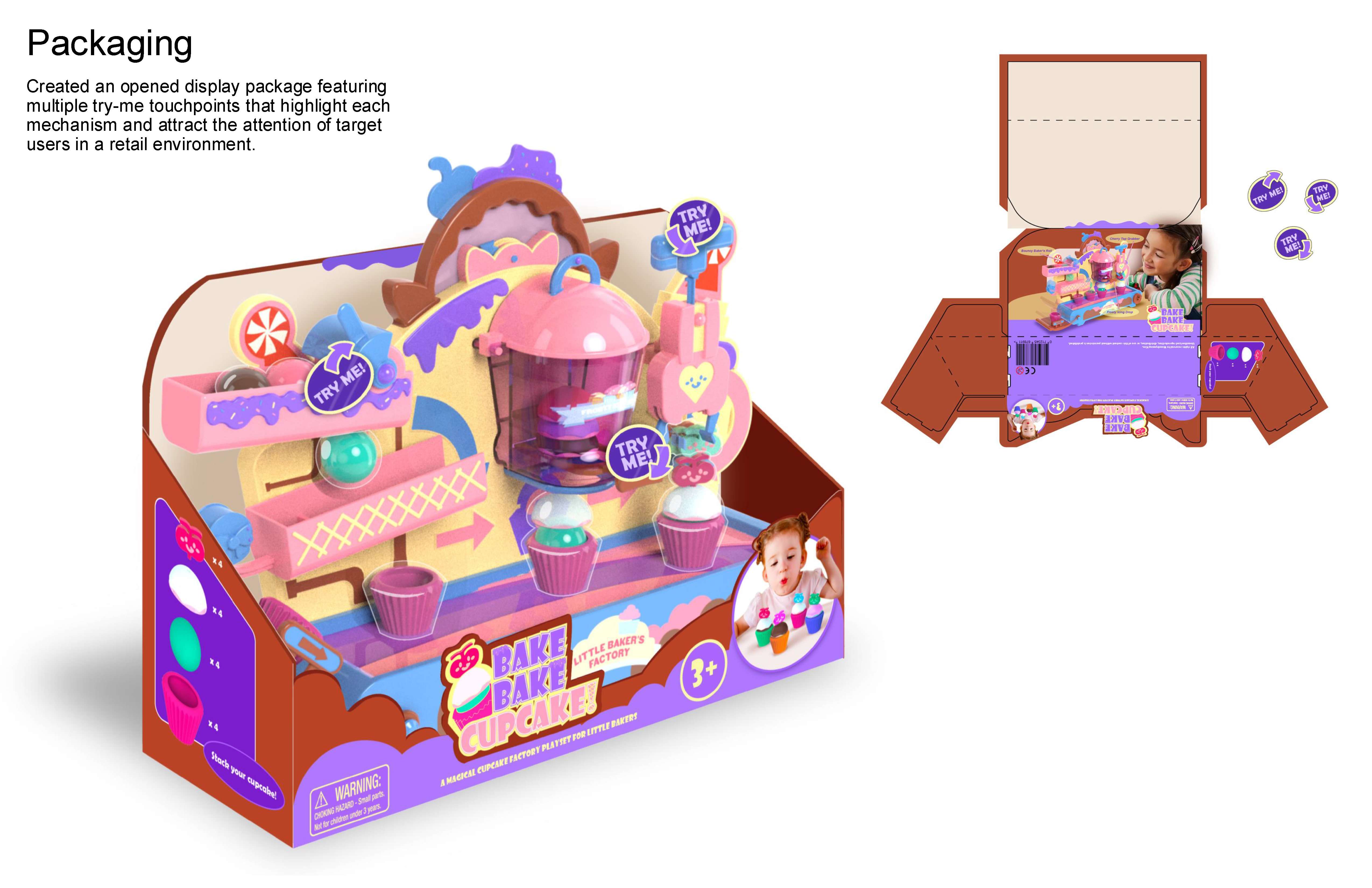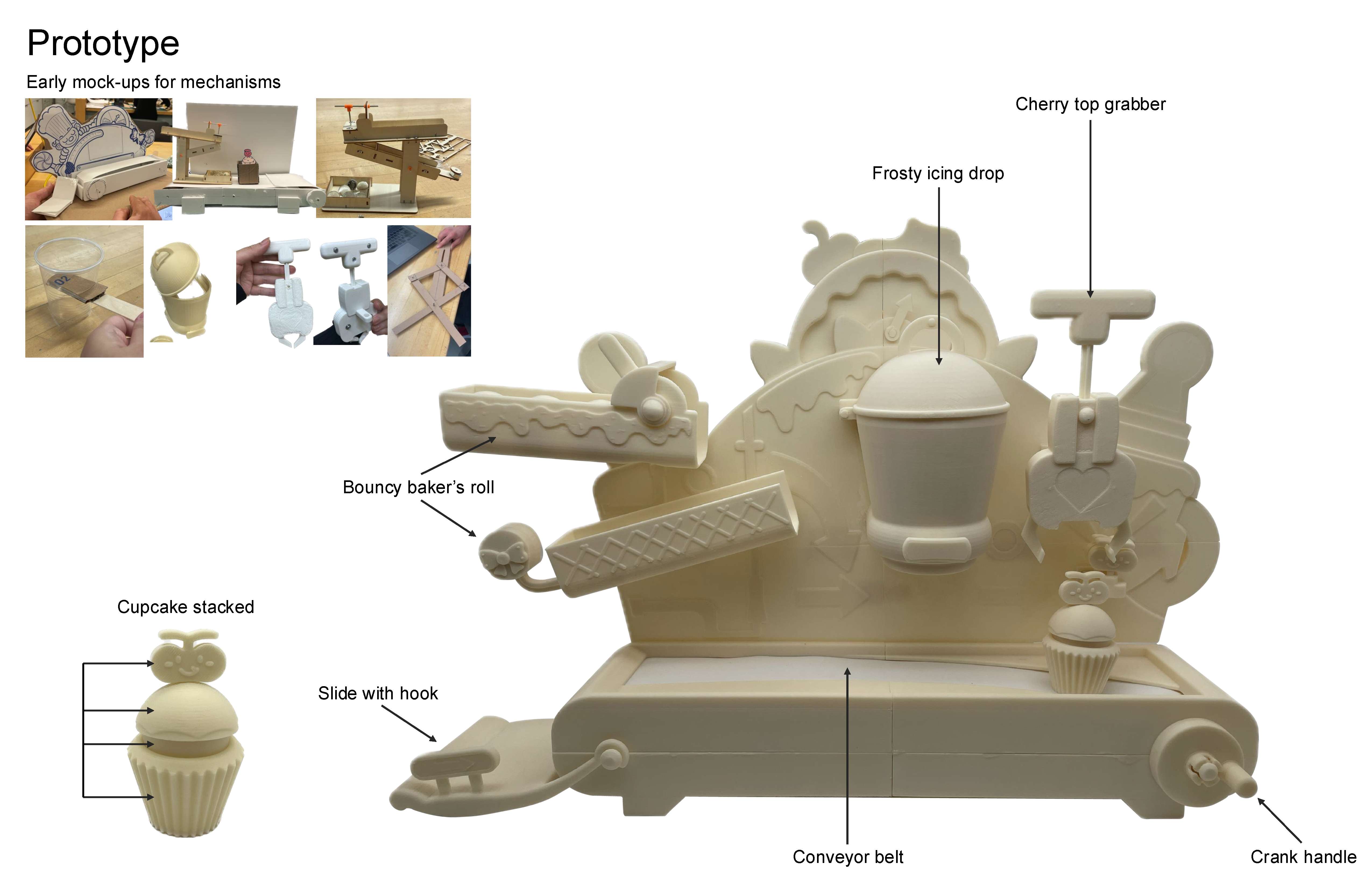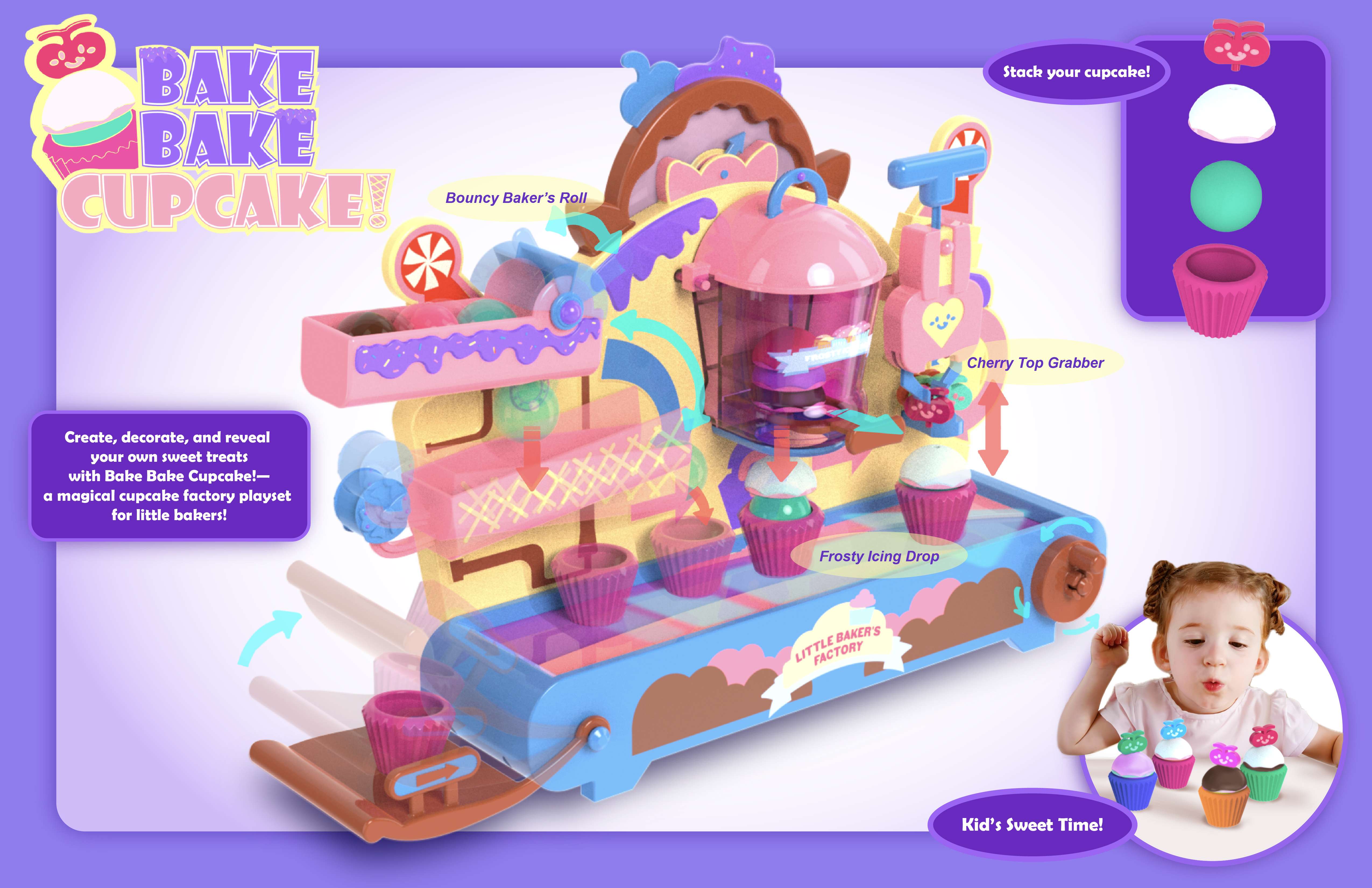 Bake Bake Cupcake is a modular cupcake factory playset that allows kids ages 3 and up to create, decorate, stack, and reveal their own pretend treats through a guided sequence of playful mechanisms. The product concept explores how mechanical interaction, sequencing, and cause-and-effect play can be integrated to encourage early creativity and motor skill development. The playset features an interchangeable track system, simple mechanisms, and clear action–reaction feedback to keep young users engaged while supporting cognitive growth. The product was developed with full consideration of the toy product development pipeline, including mechanism exploration, usability refinement, CAD geometry, rapid prototyping, and detailed manufacturing turnover packaging.