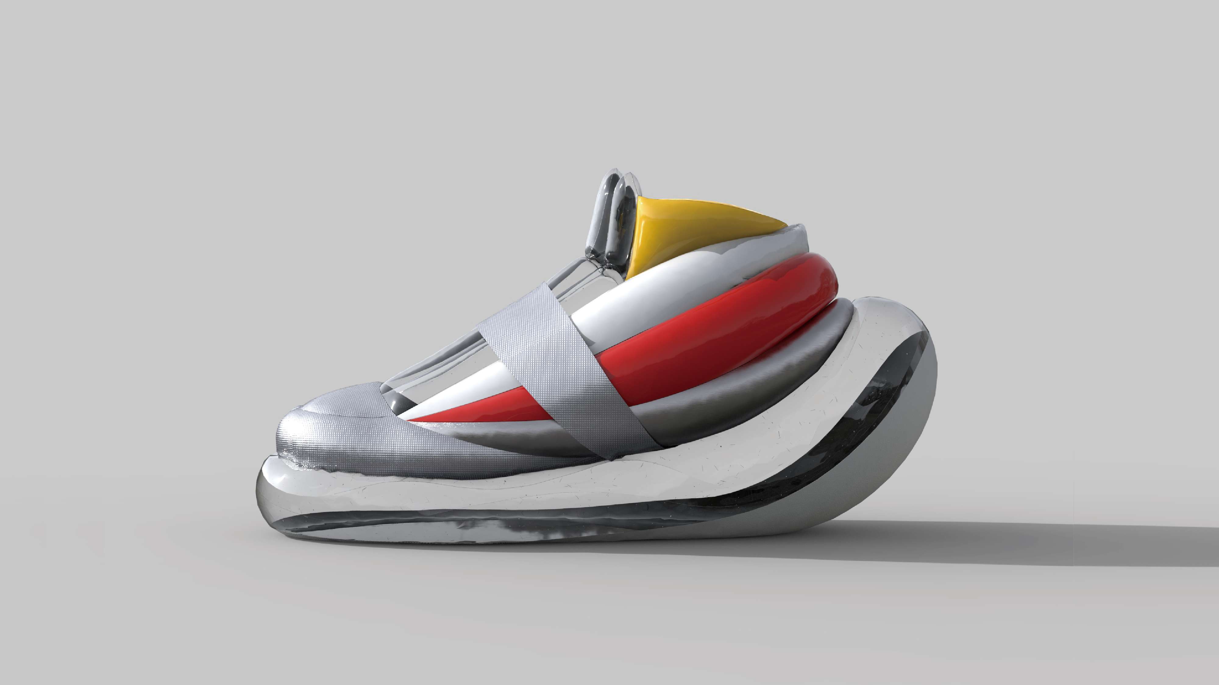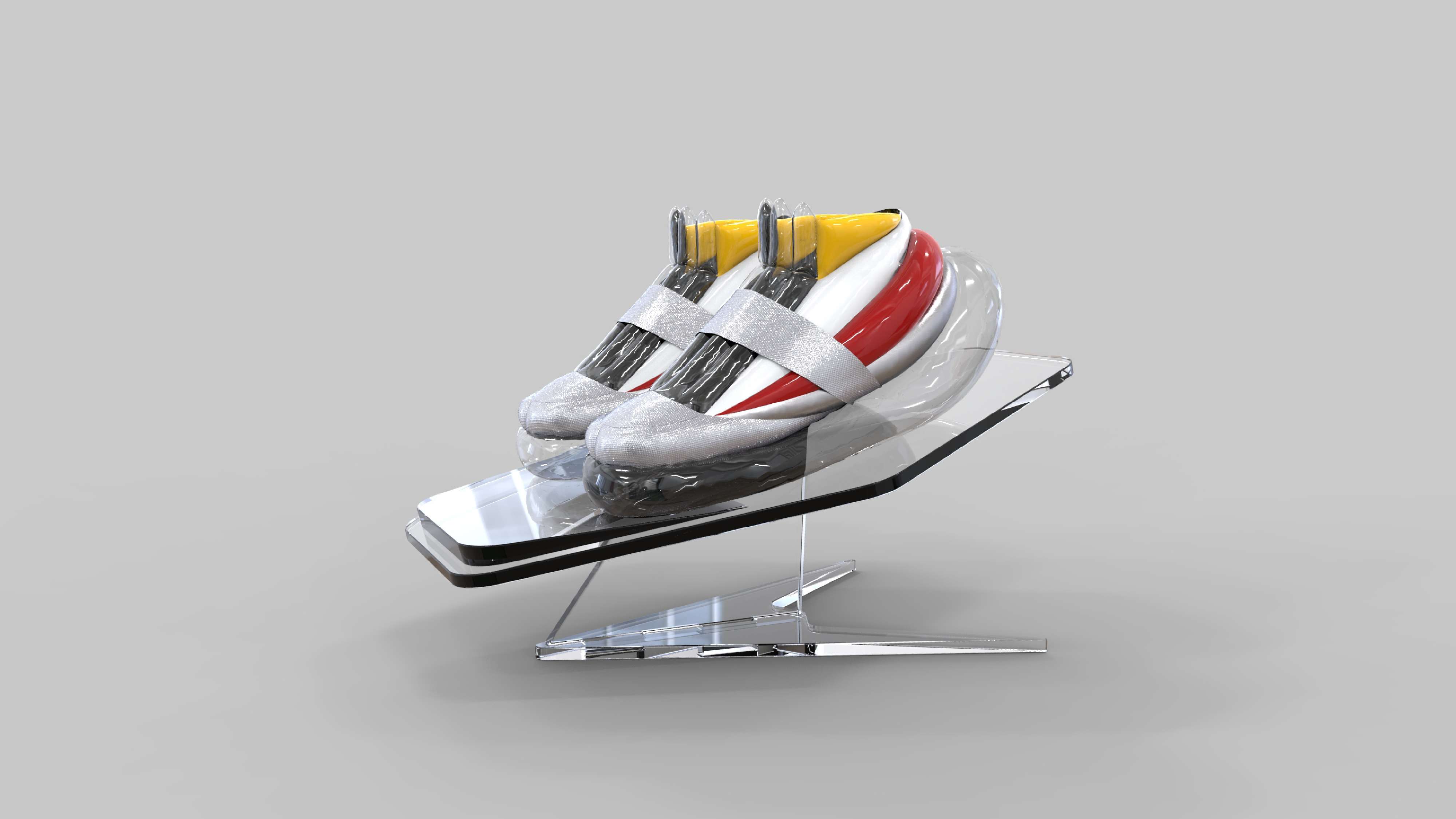 The shoe itself can be considered a work of art, as can the shoe packaging. The packaging takes inspiration from the aerodynamic qualities of a spaceship, echoing the shoe’s sense of air and lightness. The concept embodies speed, agility, and innovation. With its streamlined contours and fluid lines, the spaceship-inspired form captures the feeling of cutting through the air while emphasizing the lightweight nature of the shoes.