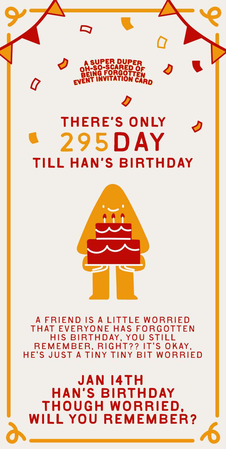 It's part of my biology, to start with an apology ... I'm a person who loves ceremony and rituals, but I'm also someone who worries about having a low presence in others' minds. I wanted to create something that would carefully, circuitously, subtly yet grandly remind my friends about my upcoming graduation ceremony and my birthday which happens to be 300 days later. Everytime when I creating things, I kept thinking God! I wish that I could change my life, be the one who could hold onto their attention, blow their minds with ideas that defy human comprehension. So this super-afraid-of-being-forgotten me has created this super-afraid-of-being-forgotten invitation card! It's currently in the testing phase - come and try it out here! or copy the address to browser: https://www.welldonehan.com/a-super-duper-oh-so-scared-of-being-forgotten-event-invitation-card
